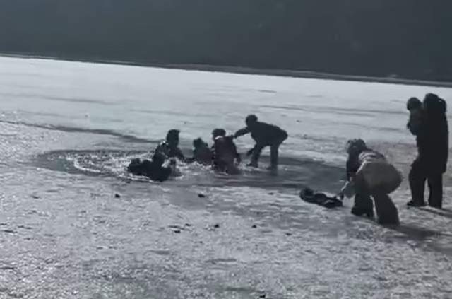 视频中,最先跑来的游客,毫不犹豫跳下湖抓住落水的孩子,紧接着又有几位游客跳到水里,4人合力将孩子抓起后推到冰面,孩子被其家人搀扶抱走。